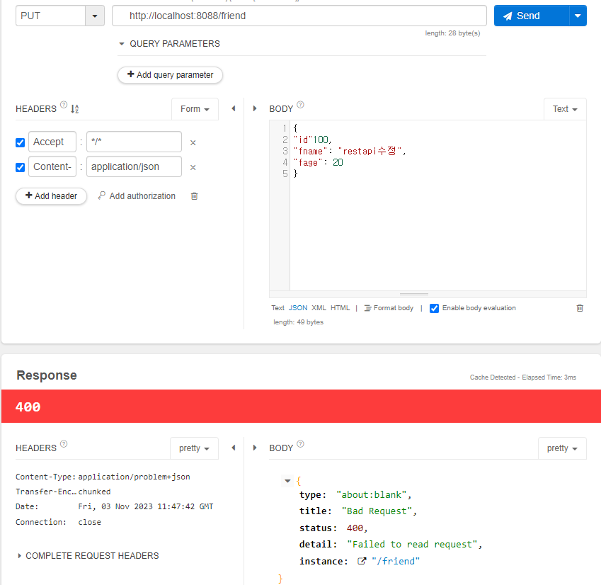 - 클라이언트에서 JSON 형식으로 전달된 데이터를 Friend 테이블에 저장하는 메서드를 구현한다. 이 때는 ID 도 전달해야 한다. (PUT)